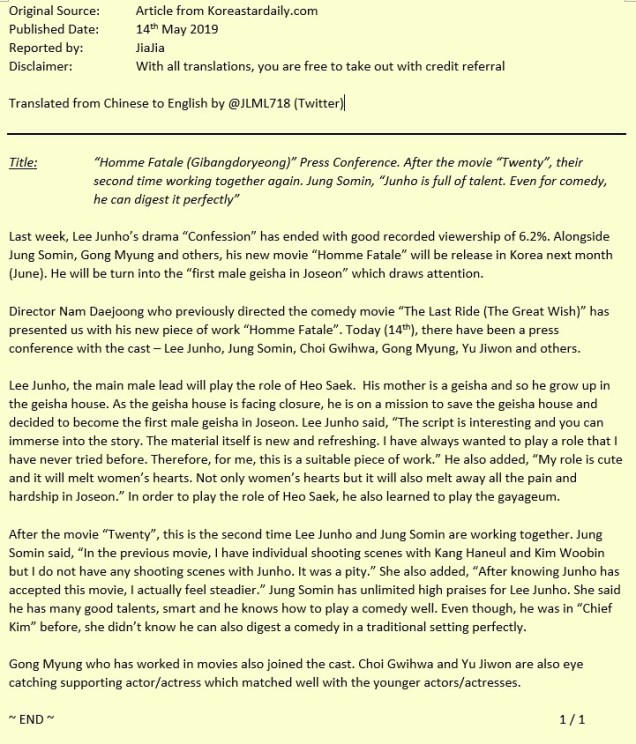 ENG TRANS – Junho – 2019.05.14 – Article on Upcoming Korean Movie ‘Homme Fatale’ June 8, 2019jlml718 Link to Online Source Share this: Share on X (Opens in new window) X Like Loading...