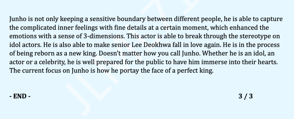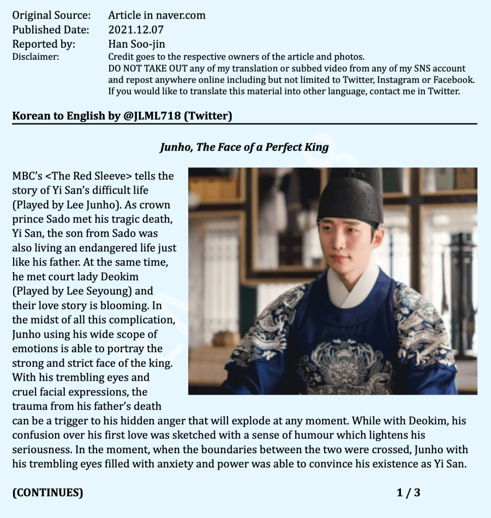 ENG TRANS – 2PM Junho – 2021.12.07 Korean Article “Junho, The Face of the Perfect King” December 8, 2021jlml718 Link to the original source Share this: Click to share on X (Opens in new window) X Like Loading...