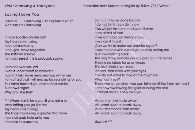ENG TRANS LYRICS – Chansung / Taecyeon – Saying I Love You / 사랑한단 말 / 説我愛妳 June 7, 2019jlml718Leave a comment Link to related video in Go Crazy Concert