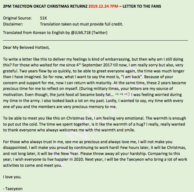 ENG TRANS – 2PM Taecyeon – OkCat Christmas Returnz 2019.12.24 (7pm) 2019.12.25 (2pm & 7pm) – The 3 Letters read out to the fans in the 3 performances December 28, 2019January 4, 2020jlml718Leave a comment