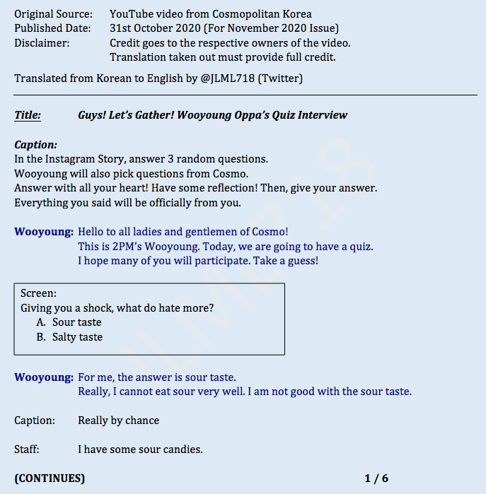 ENG TRANS – 2PM Wooyoung – Quiz Video with Cosmopolitan Korean November 2020. November 1, 2020jlml718Leave a comment Link to the Original Source: Cosmopolitan’s Video