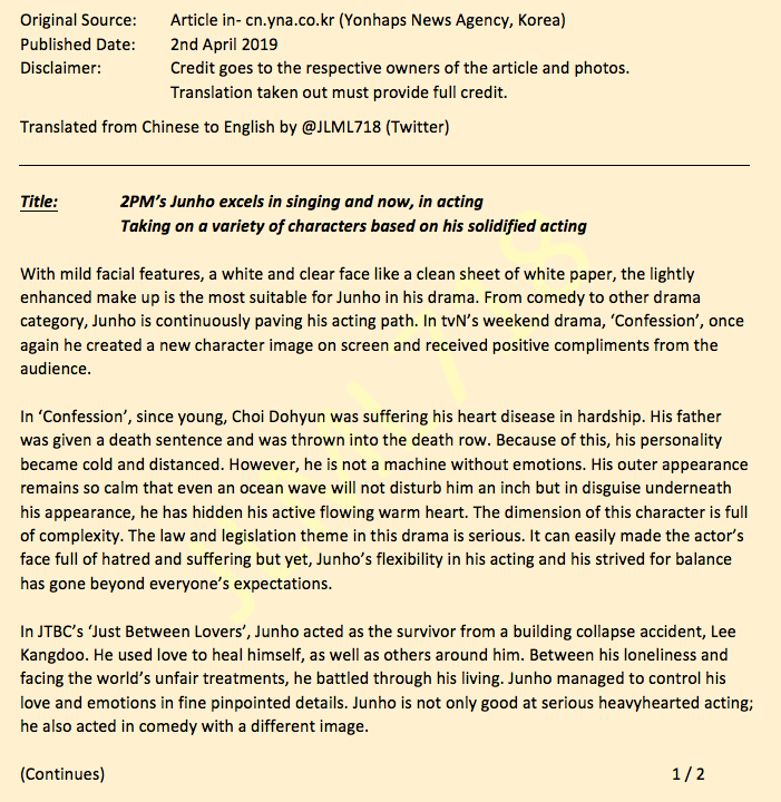 ENG TRANS – 2PM Junho – Online Article Praising Junho’s Acting 2019.04.02