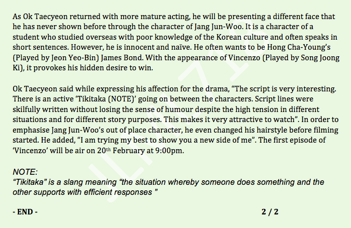 ENG TRANS – 2PM Taecyeon – 2021.01.27 Korean Article Revealing the character of Jang Jun-Woo in the drama “Vincenzo” January 27, 2021jlml718Leave a comment