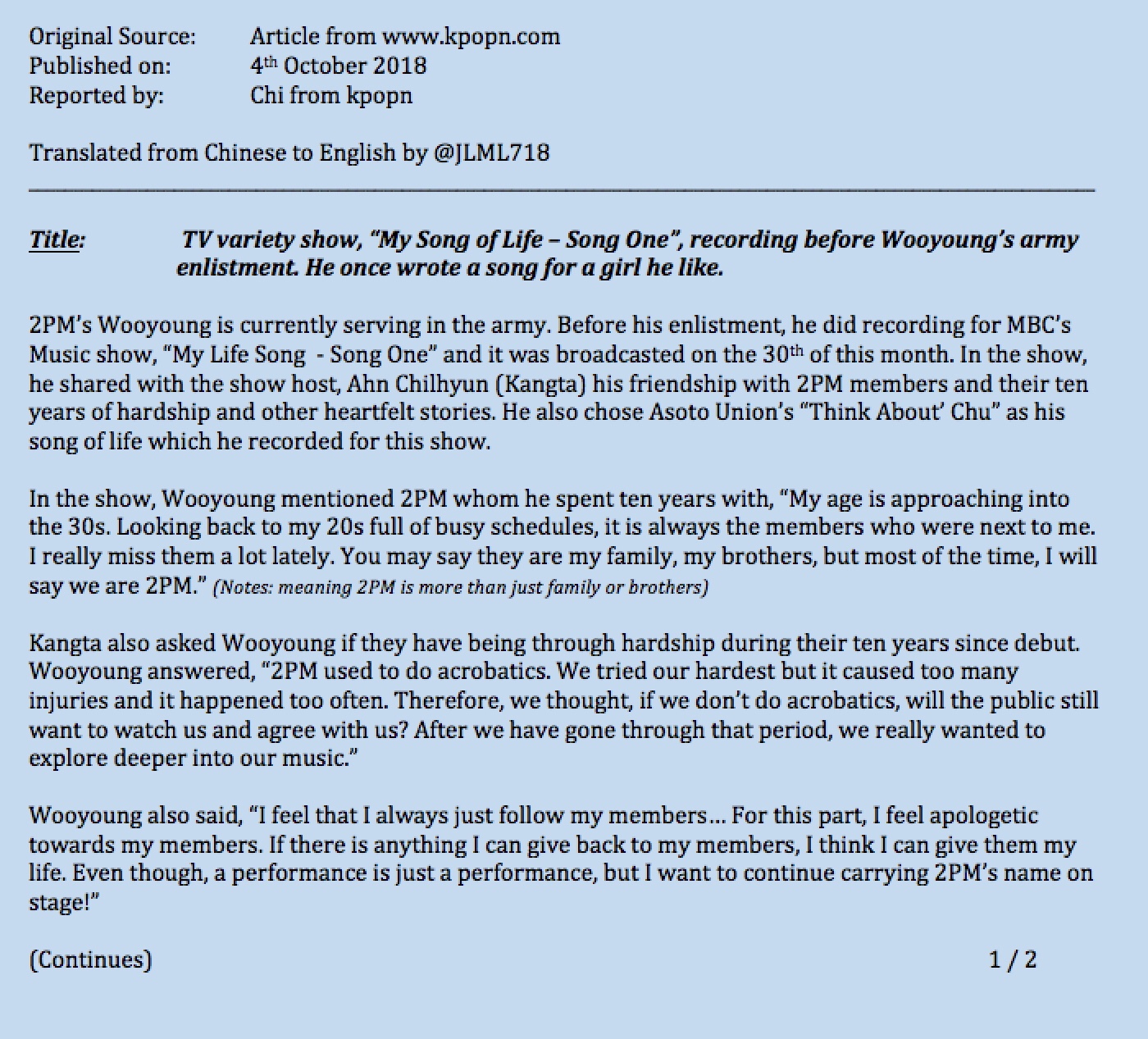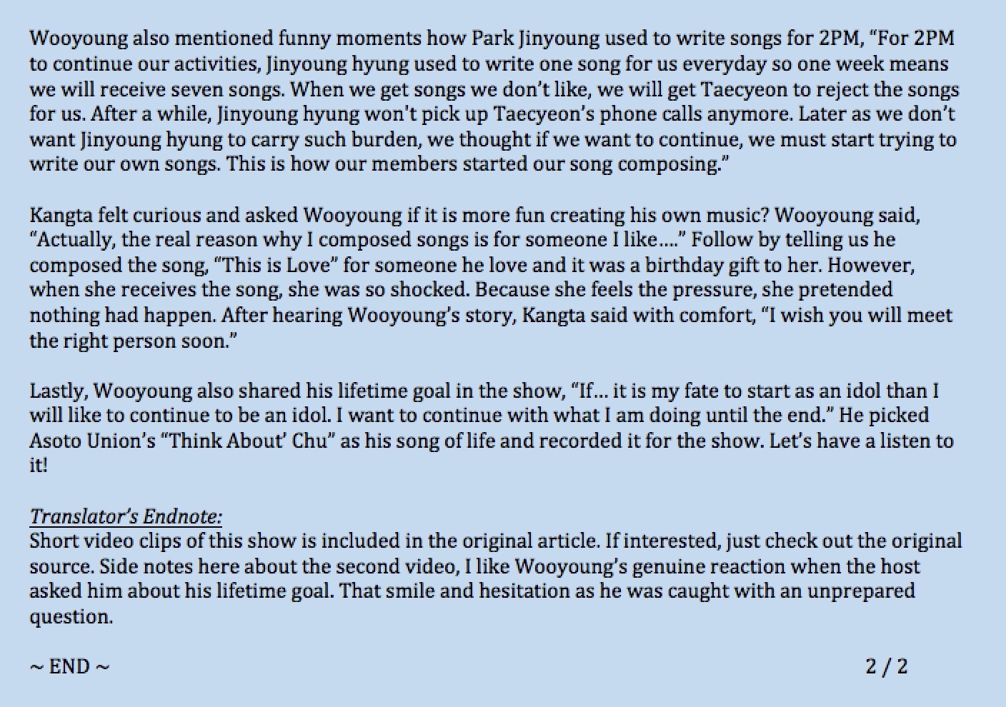ENG TRANS – Wooyoung – 2018 Article about his MBC TV Appearance where he talked about his song of life, 2PM and song he wrote for a girl June 8, 2019jlml718Leave a comment Link to Original Online Article Link to Wooyoung’s ‘Think About Chu’ MV Link to Asoto Union’s song with English Sub Wooyoung’s ‘This is Love’ with English Sub